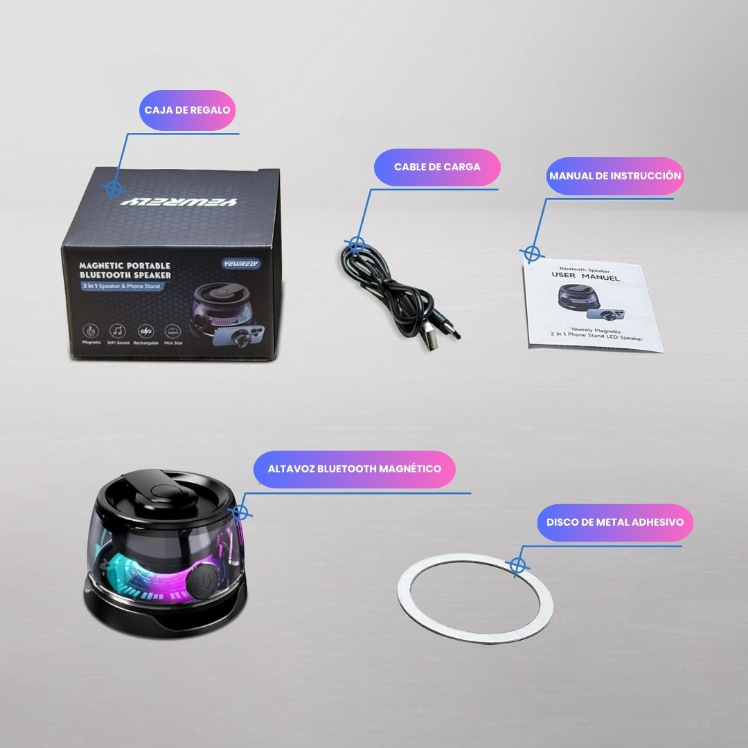 Con su fijación magnética, este parlante se adapta a tu vida: pégalo a tu teléfono, mochila o cualquier superficie metálica. ¡Tu sonido, siempre a tu alcance! 🔊✨